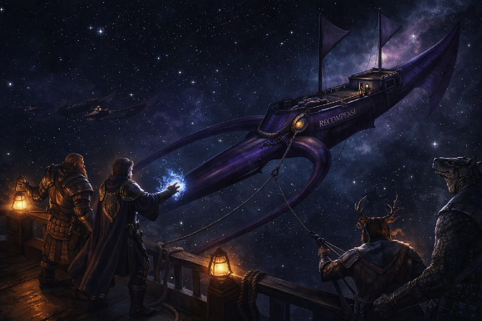 They were about ten days out of port on Oerth, heading toward the sphere’s edge. They still had over two months of travel ahead of them. They came out of spelljamming speed in proximity to a pair of purple squid ships. The vessels sat motionless beside one another with their air envelopes overlapping. A crewman raised semaphore flags and signaled in their direction. The man signaled they were peaceful merchants and encouraged them to approach and converse.