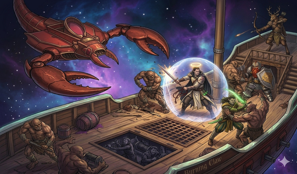 About three weeks later, Their ship lurched out of spelljamming speed. Ahead, a sleek vessel glided through the void—shaped like a manta ray, its form smooth as if grown rather than built. It moved with silent grace. Its hull glowed faintly from within, like phosphorescent bone. It turned with remarkable maneuverability, almost like a living thing. Despite its alien form, it bore a wooden deck. Dark-robed figures drifted across it, wearing copper bracers and carrying staves shaped like rudders. They chanted in unison: “The Deck is laid. The Helm is stirring. The Spelljammer shall return. Prepare thyself.”