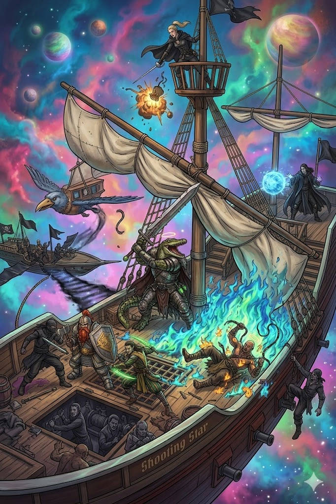 Helg cast blade barrier, which severed the tow ropes and damaged several of the enemy crew. Battle erupted as Callum cast dark way and created a bridge of shadows crossing between their ships. The woman ordered her crew to gut the boy on the other ship, and they rushed to obey, cruel knives in hand. Polaris and Hekera ran down the bridge to engage. Much to their surprise, the woman flew across to the Shooting Star‘s crow’s nest! She then did something truly horrific.